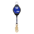20’ retractable web, swivel top plastic housing, built in shock absorber, ¾” load indicator hook, ½” carabiner included. Blue housing. Min breaking strength 4500 lbs. Meets or exceeds ANSI Z359.14-2012. Class B.